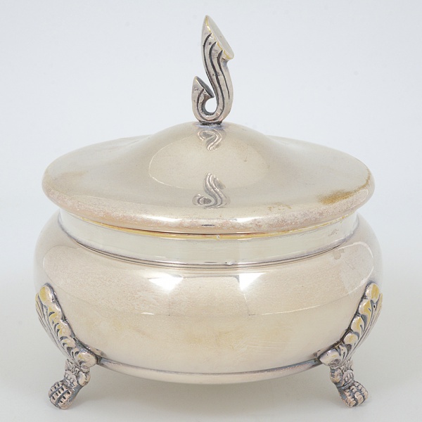 • METAL PRATEADO, uma (1) bomboniere com tampa, pés de bicho, pega da tampa colada, medindo 15 cmdiâmetro, sinais de uso, vide foto.