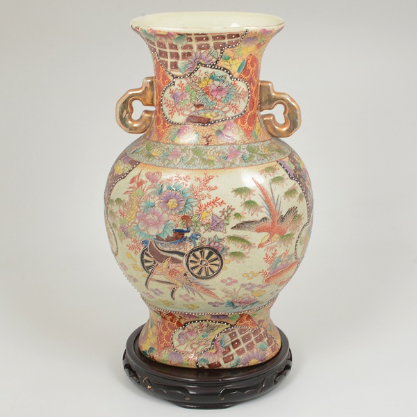 • PORCELANA CHINESA, um (1) imponente vaso com ornamentação policromada representando paisagem comguerreiros a cavalo, montanhas e elementos vegetalistas, generosos arremates a ouro, marca de origem na base emlegenda e caracteres Made in China, além da palavra SATSUMA (possivelmente indicando o padrão utilizado, uma vezque é uma região do Japão), acompanha peanha em madeira torneada, ebanizada e com entalhes vazados, altura do vaso35,5 cm, peanha medindo 18 cm diâmetro e 3 cm altura, sinais de uso, vide foto.