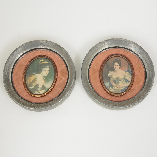 • QUADRINHOS, par (2) litos policromadas representando damas, moldura interna oval, moldura externa redonda,medindo 14,5 cm diâmetro, vide foto.