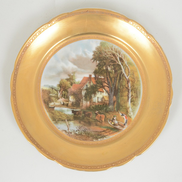 • PORCELANA, um (1) prato decorativo, ornado policromada representando paisagem rural holandesa, generososarremates a ouro, medindo 23 cm diâmetro, manufatura SALER (Ernesto & Hugo Saler Ltda., Guarulhos, SP, ativo nasdécadas 50/60), vide foto.