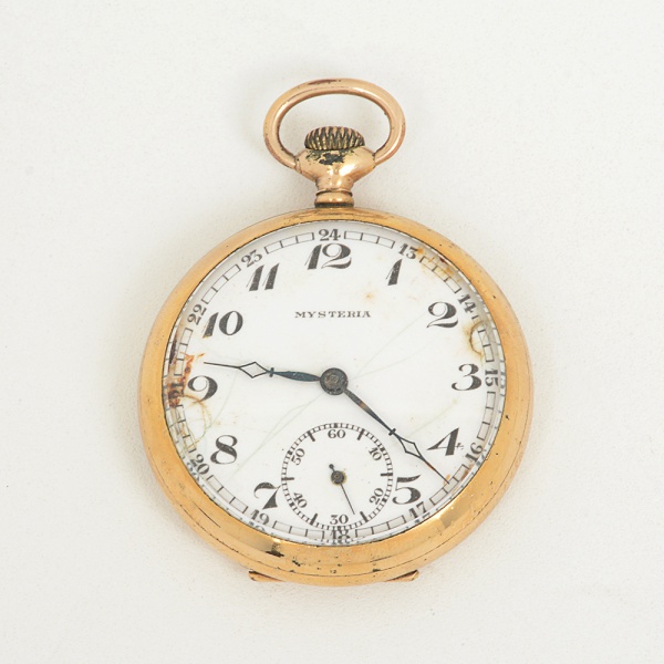 • RELÓGIO, um (1) antigo de algibeira, marca MYSTERIA (fabrica de relógios Suíça, possivelmente fundada em1895, muitos fabricantes de relógios usavam seus mecanismos, como: Tavannes e Tacy, a partir de 1913; Adolf Schwobe Klein, a partir de 1922, existe uma citação que a fabrica CYMA, chegou a usar o mecanismo, não encontrei mais nadasobre este fabricante), mostrador branco com algarismos arábicos com pequenas trincas na borda, caixa ornada emguilhochê, plaque d or, parado, medindo 42 mm diâmetro, usado, não testado e sem garantia, vide foto.