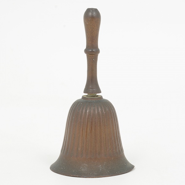 • BRONZE, uma (1) sineta de mão, canelada, amassados na borda, medindo 10 cm altura, vide foto.