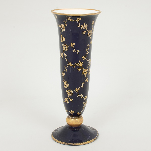 • PORCELANA ALEMÃ, um (1) vaso floreiro no formato de corneto, fuste quase esférico, base em saia (quebrada ecolada), tonalidade azul cobalto, ornamentação vegetalista a ouro, manufatura LINDNER, Kueps Bavária, Made inGermany, medindo 27,5 cm altura, sinais de uso, vide foto.