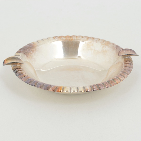 • METAL PRATEADO, um (1) cinzeiro com borda canelada, medindo 11 cm diâmetro, sinais de uso, vide foto.