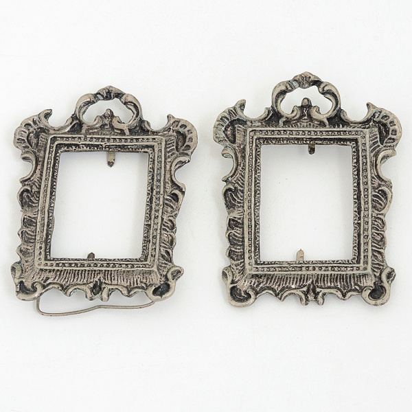• FOTOGRAFIA, par (2) porta-retratos, confeccionados em metal prateado, ornamentação relevada em volutas,medindo 8,5 x 6,5 cm, faltam o vidro e o suporte, sinais de uso, vide foto.