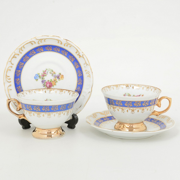 • PORCELANA, par (2) xícaras para chá, ornamentação floral policromada, faixa na tonalidade azul, generososarremates a ouro, manufatura SCHMIDT (Pomerode, SC; Mauá, SP; Campo Largo, PR, fundada em 1945,ainda ematividade, maior fábrica de porcelana da América Latina), ideais para coleção de cristaleira, vide foto.
