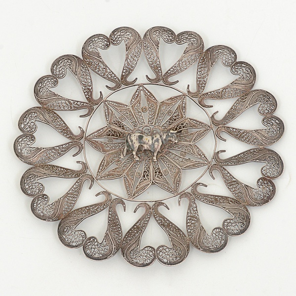 • METAL PRATEADO, uma (1) fruteira filigranada, parte central representando touro, medindo 17,5 cm diâmetro,sinais de uso, vide foto.