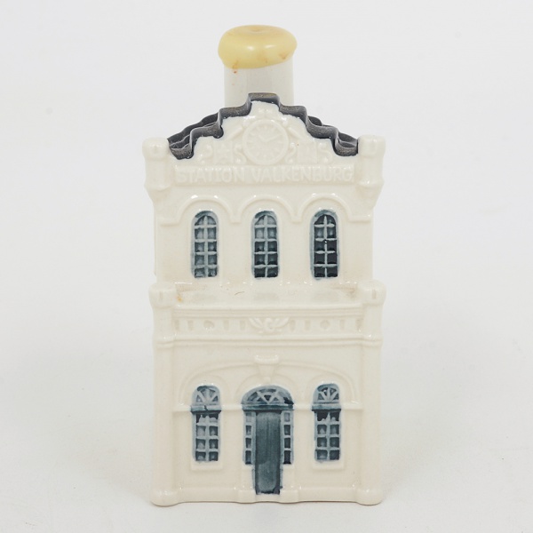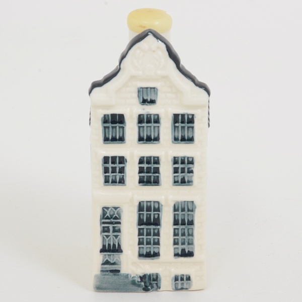 • COLECIONISMO PORCELANA DE DELFT, uma (1) garrafa miniatura na forma de casa, do destilado YoungDutch Bols Jenever, lacrada e ainda com conteúdo, capacidade 35 ml, distribuída a todos os passageiros dos voos daKLM INTERCONTINENTAL, pintada na técnica blue and white, inspirada nas casas existentes no Canal de Amsterdãe outras cidades históricas da Holanda, numerada 72, colecionada no mundo inteiro, medindo 9,5 cm altura, vide foto.