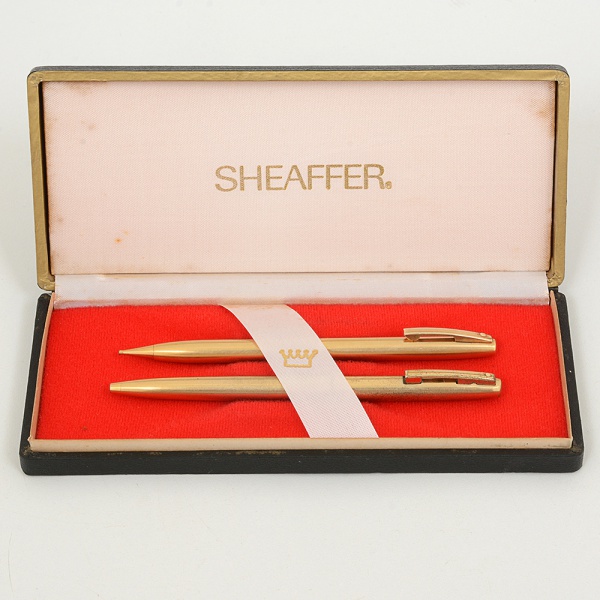 • COLECIONISMO, conjunto com dois (2) itens: 1 caneta e 1 lapiseira, marca SHEAFFER, modeloINTERNACIONAL, douradas, acondicionadas na caixa original, falta a carga, sinais de uso, vide foto.
