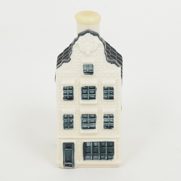 • COLECIONISMO PORCELANA DE DELFT, uma (1) garrafa miniatura na forma de casa, do destilado YoungDutch Bols Jenever, lacrada e ainda com conteúdo, capacidade 35 ml, distribuída a todos os passageiros dos voos daKLM INTERCONTINENTAL, pintada na técnica blue and white, inspirada nas casas existentes no Canal de Amsterdãe outras cidades históricas da Holanda, numerada 104, colecionada no mundo inteiro, medindo 9,5 cm altura, vide foto.