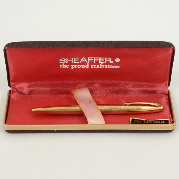 • COLECIONISMO, uma (1) caneta da marca SHEAFFER, faltando a carga, confeccionada em metal dourado,acondicionada na caixa original, vide foto.