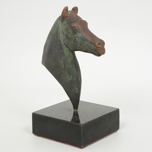 • ESCULTURA, uma (1) equestre representando cabeça de cavalo, confeccionada em bronze, assinada P. THADEE,base em granito negro, medindo 18 cm altura, vide foto.