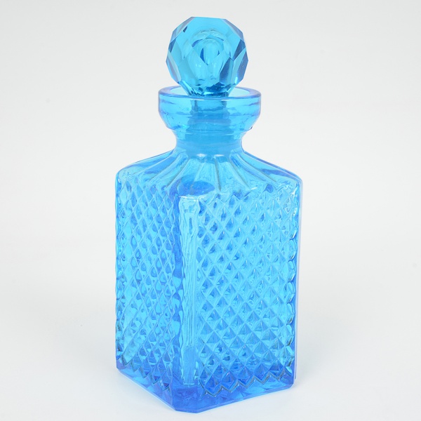 • VIDRO, uma (1) licoreira, azul, translúcida, modelagem geometrizada, tampa facetada, fundo estrelado, medindo 22cm altura, sinais de uso, vide foto.