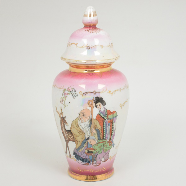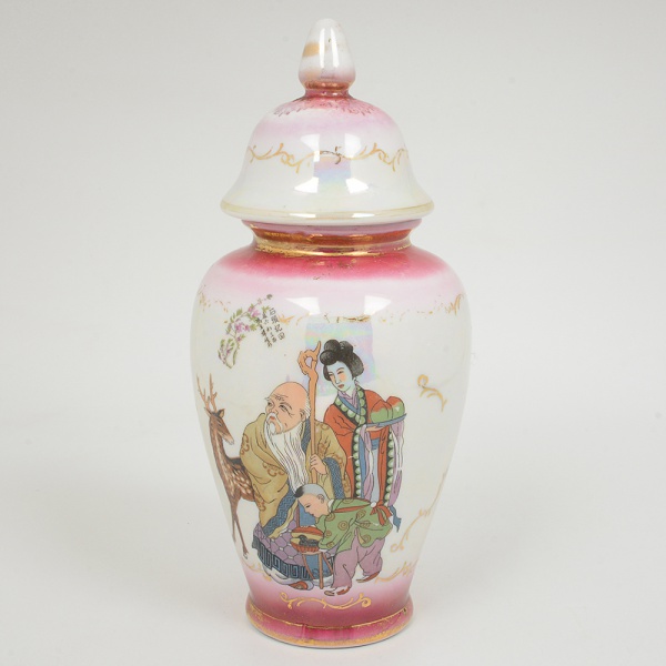 • PORCELANA, um (1) vaso com tampa, ornamentação dita chinoire em policromia sobre fundo nacarado e emdegrade, arremates a ouro já com sinais de desgastes, medindo 26,5 cm altura, vide foto.