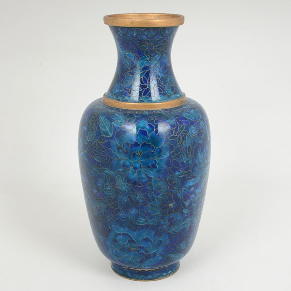 • CLOISONNÉ, um (1) vaso em bronze com esmaltação vegetalista em tons de azul, medindo 31 cm altura, sinais deuso, vide foto.