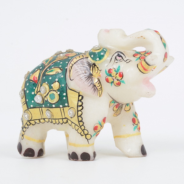 • ESCULTURA, uma (1) representando elefante, confeccionada em pó de mármore, pintada a mão em policromia,apliques variados e douração, medindo 7,5 cm comprimento, vide foto.