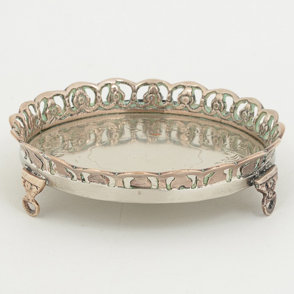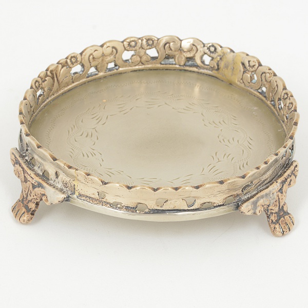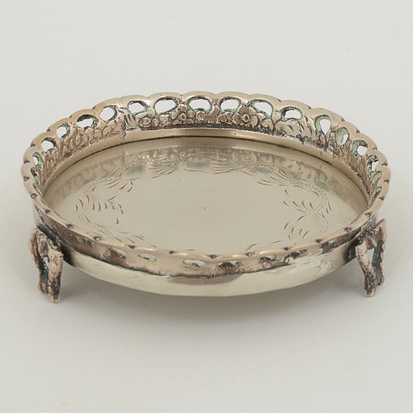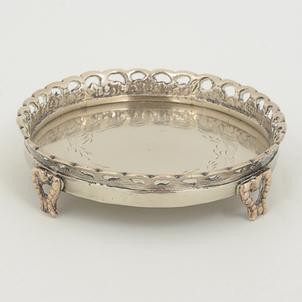 • METAL PRATEADO, uma (1) pequena salva com fundo burilado, borda vazada em elementos vegetalistas, pésrelevados em elementos vegetalistas com terminações em garra, medindo 10,5 cm diâmetro, sinais de uso, vide foto.