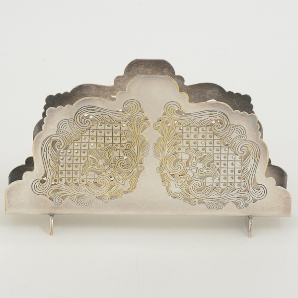• METAL PRATEADO, um (1) porta guardanapo, vazado em pérgulas e elementos vegetalistas, marca PRATARÉGIA 90, medindo 13,5 cm comprimento, sinais de uso, vide foto.