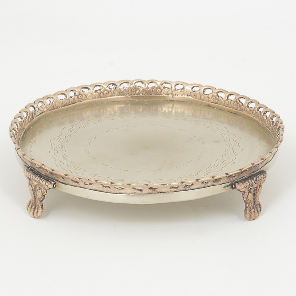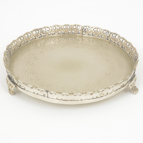 • METAL PRATEADO, uma (1) pequena salva com fundo burilado, borda vazada em elementos vegetalistas, pésrelevados em elementos vegetalistas com terminações em garra, medindo 19,5 cm diâmetro, sinais de uso, vide foto.
