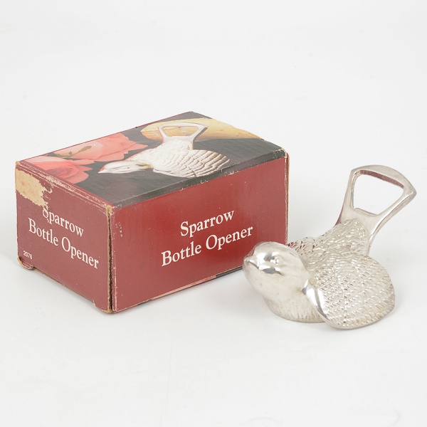 • METAL PRATEADO, um (1) abridor de garrafas no formato de pássaro, SPARROW BOTTLE OPENER,acondicionado na caixa, vide foto.