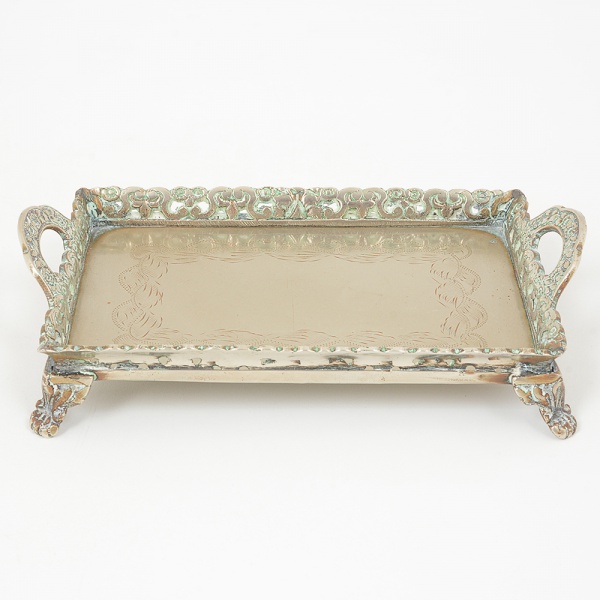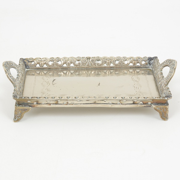 • METAL PRATEADO, uma (1) pequena bandeja retangular, fundo burilado, borda vazada em volutas e elementosvegetalistas, pés com terminações em garra, medindo 17 x 12 cm, sinais de uso, vide foto.
