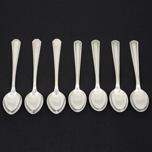 • METAL PRATEADO, sete (7) colheres para chá de dois modelos distintos: 3 da marca WOLFF (tradição desde1894), ornadas com barrado grego, medindo 12 cm; 4 da marca RADIO, ornamentação geometrizada, medindo 12 cm,todas com sinais de uso, vide foto.