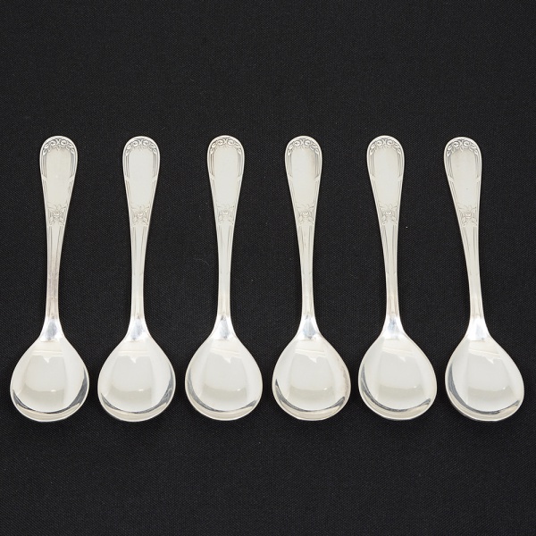 • METAL PRATEADO, seis (6) colheres para sobremesa, marca WOLFF (tradição desde 1894), ornada com frisos erosas, medindo 12,5 cm, sinais de uso, vide foto.
