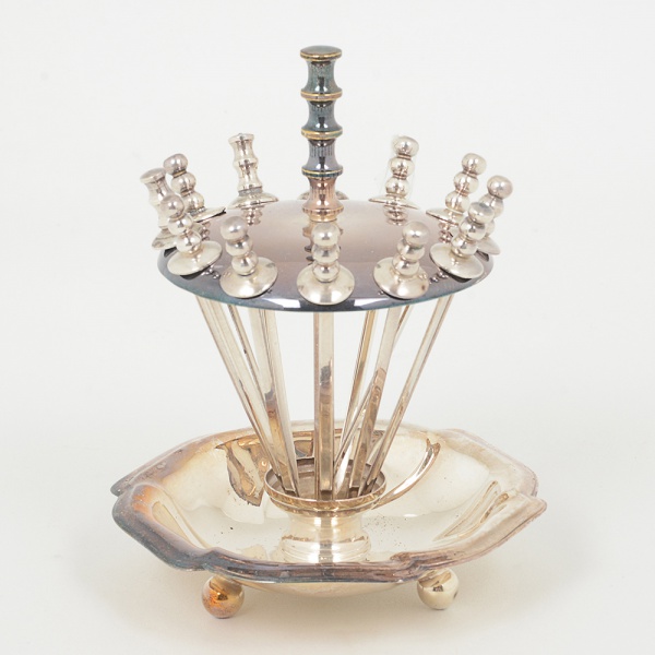 • METAL PRATEADO, uma (1) petisqueira com 12 espetos no formato de florete, medindo 12,5 cm altura, pésesféricos, sinais de uso, vide foto.