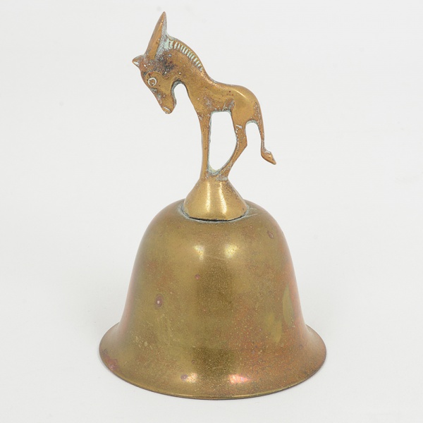 • BRONZE, uma (1) sineta de mão, pega no formato de burrico, falta o badalo, medindo 11 cm altura, vide foto.
