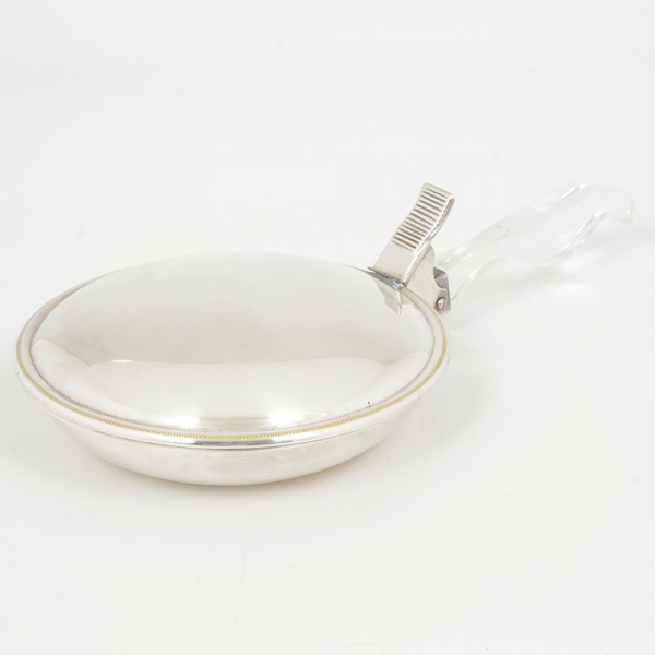 • METAL PRATEADO, um (1) cata migalhas com cabo em acrílico, tampa solta da pega, medindo 13,5 cm diâmetromais o cabo, sinais de uso, vide foto.