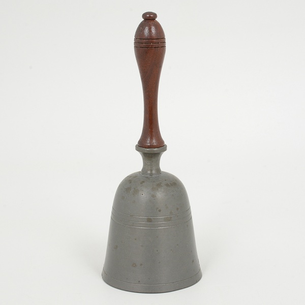 • PEWTER, uma (1) sineta de mão, puncionada MG X FL, pega em madeira torneada, medindo 18 cm altura, sinaisde uso, vide foto.