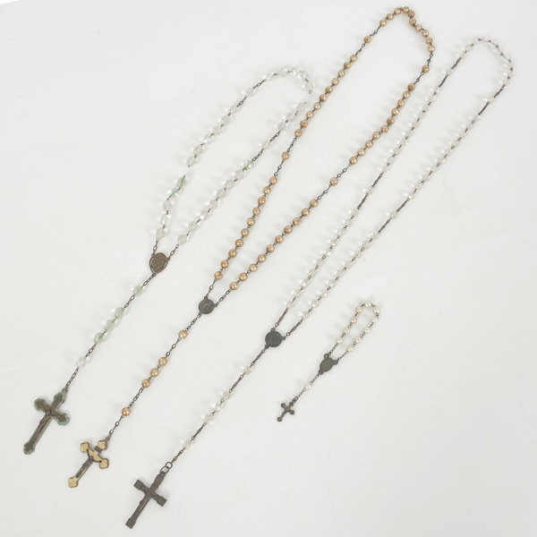 • ARTE SACRA, quatro (4) itens: 3 terços e 1 dezena, confeccionados em materiais variados: metal dourado,bronze, vidro facetado, etc., um terço partido e com perdas, todos os itens com sinais de uso, medindo o maior 46 cm,vide foto.