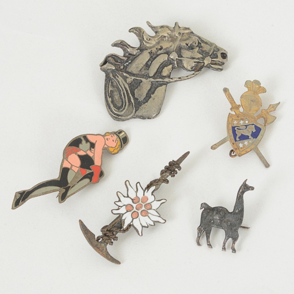 • BIJUTERIAS, cinco (5) broches distintos, confeccionados em metal dourado e prateado, três deles com esmalte,vide foto.