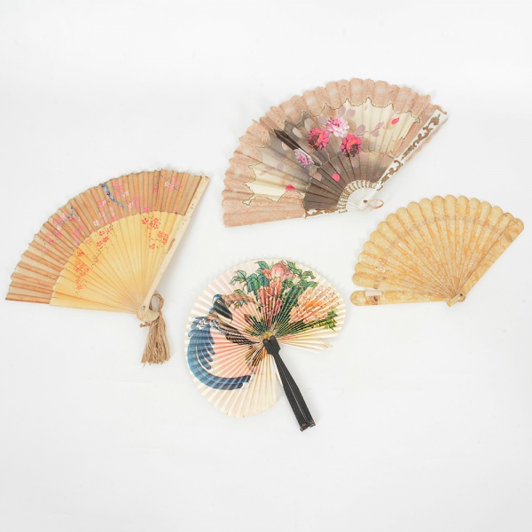 • DIVERSOS, quatro (4) leques distintos confeccionados em materiais variados: polímero, metal, madeira, tecido,etc., alguns no estado, medindo o maior fechado 25 cm, vide foto.