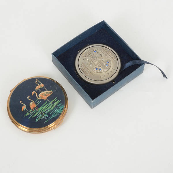 • DIVERSOS, duas (2) trousses distintas: 1 confeccionada em metal dourado, tampa em polímero ornada comflamingos em policromia, espelho interno, medindo 8 cm diâmetro; 1 confeccionada em metal prateado, tampa relevadacom simbologia egípcia, espelhos internos, placa se soltando, medindo 6,5 cm diâmetro, ambas com sinais de uso, videfoto.