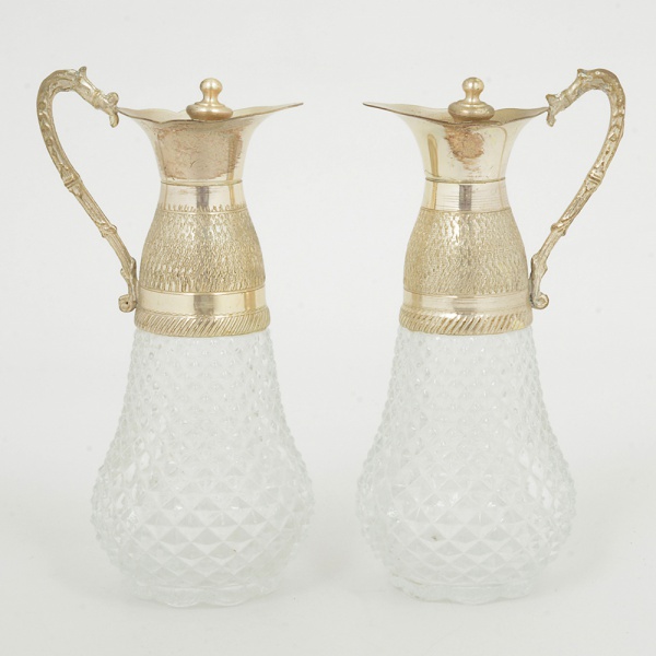 • VIDRO, par (2) galhetas, incolores e translúcidas, modelagem dita bico de jaca, monture em metal prateado,medindo 14,5 cm altura, vide foto.