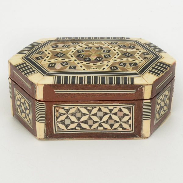 • DIVERSOS, uma (1) caixa com marchetaria em madrepérola, marfim ou símile, ébano, etc., geometrizada, formatohexagonal, interior com forração em papel camurça, medindo 12,5 cm comprimento, sinais de uso, vide foto.