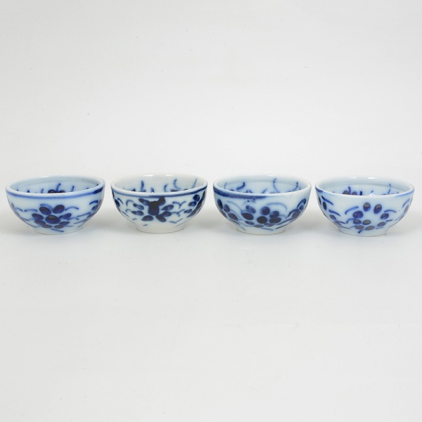 • PORCELANA, quatro (4) tigelas com ornamentação vegetalista pintada a mão na técnica blue and white,manufatura MONTE SIÃO (fundada em Minas Gerais no ano de 1959 ainda em atividade), medindo 9,5 cm diâmetro,sinais de uso, vide foto.