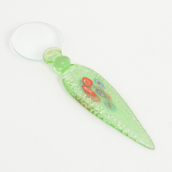 • DIVERSOS, uma (1) lupa com cabo em MURANO, tonalidade verde com pó de prata e sulfitos coloridos em flores,medindo 15 cm comprimento, vide foto.