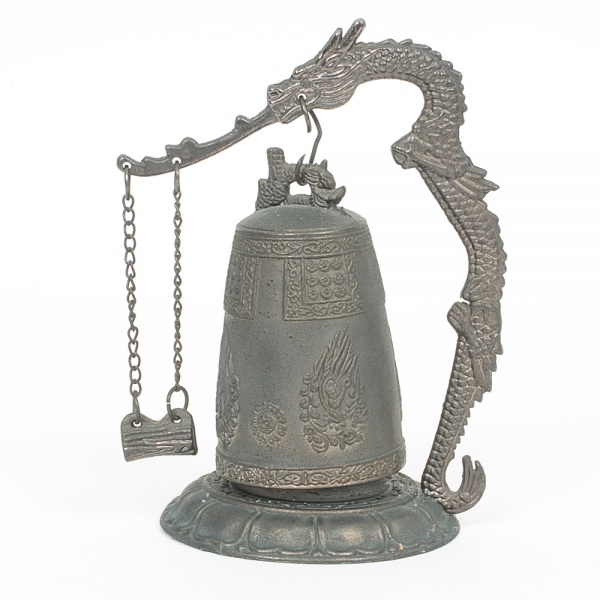 • METAL, uma (1) sineta de mesa com haste no formato de dragão celestial, medindo 13 cm altura, sinais de uso,vide foto.