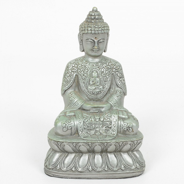 • ESCULTURA, uma (1) representando BUDDHA (popularmente conhecido como SIDDHARTHA GAUTAMA, foium príncipe de uma região no sul do atual Nepal que, tendo renunciado ao trono, se dedicou à busca da erradicação dascausas do sofrimento humano e de todos os seres, e desta forma encontrou um caminho até ao despertar ou iluminação),encontra-se em posição de meditação sobre flor de lótus, confeccionada em estuque prateado, medindo 12 cm altura,vide foto.