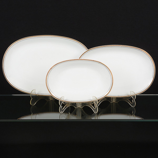 • PORCELANA, três (3) travessas ovais, a menor delas de borda alta, ornamentação em barrado contínuo nastonalidades preta e dourada, modelo MEDAILLON, manufatura RENNER (Porto Alegre, RS, fundada em 1942; em1998 foi vendida para a Vista Alegre de Portugal; em 1999 mudou a razão social para Vista Alegre do Brasil), medindo33 x 22,5 cm; 29 x 19 cm e 23 x 15,5 cm, sinais de uso, vide foto.