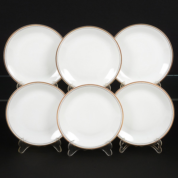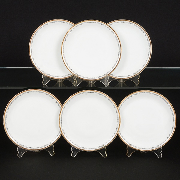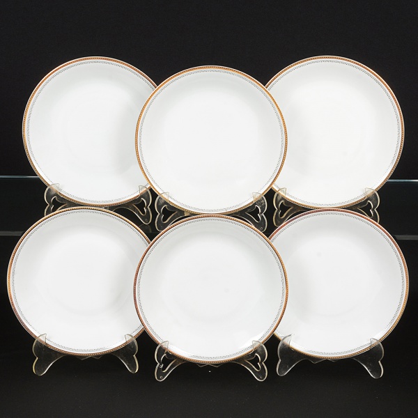• PORCELANA, seis (6) pratos para sobremesa, ornamentação em barrado contínuo nas tonalidades preta edourada, modelo MEDAILLON, manufatura RENNER (Porto Alegre, RS, fundada em 1942; em 1998 foi vendida paraa Vista Alegre de Portugal; em 1999 mudou a razão social para Vista Alegre do Brasil), medindo 17,5 cm diâmetro,sinais de uso, vide foto.