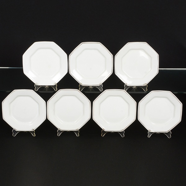 • PORCELANA, sete (7) pratos para sobremesa, octogonais, arremates com frisos prateados, manufatura SCHMIDT(Pomerode, SC; Mauá, SP; Campo Largo, PR, fundada em 1945, ainda em atividade, maior fábrica de porcelana daAmérica Latina), um deles com bicado na borda, medindo 19 x 19 cm, sinais de uso, vide foto.