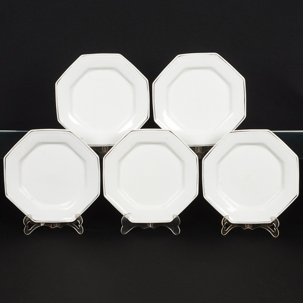 • PORCELANA, cinco (5) pratos para sobremesa, octogonais, arremates com frisos prateados, manufaturaSCHMIDT (Pomerode, SC; Mauá, SP; Campo Largo, PR, fundada em 1945, ainda em atividade, maior fábrica deporcelana da América Latina), medindo 19 x 19 cm, sinais de uso, vide foto.