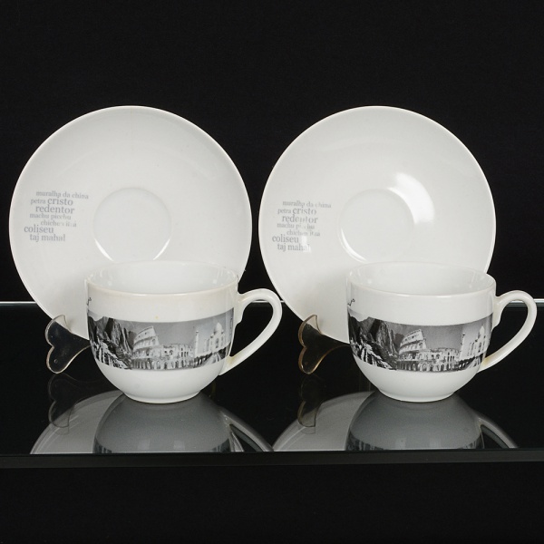 • PORCELANA, par (2) xícaras para chá, ornadas com pontos turísticos mundiais: Taj Mahal; Coliseu; CristoRedentor; Petra, Muralha da China, Machu Picchu e Chichen Itzá, origem China, ideais para coleção de cristaleira, videfoto.