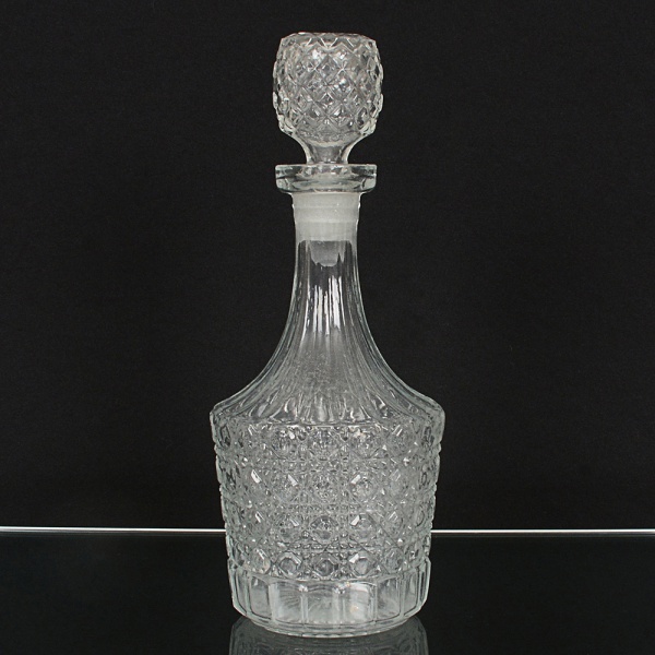 • VIDRO, uma (1) licoreira, incolor e translúcida, moldada em geométricos e caneluras, medindo 29 cm altura,sinais de uso, vide foto.