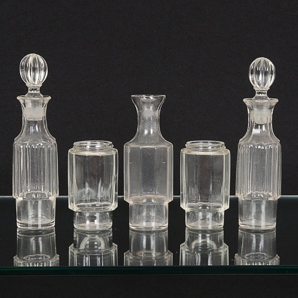 • VIDRO, cinco (5) peças para galheteiro, incolores e translúcidas, moldadas em gomos e caneluras, sendo: 2 (par)galhetas com tampa; 1 galheta sem a tampa e 2 polvilhadores sem a tampa, medindo a maior peça 16 cm altura, sinaisde uso, vide foto.