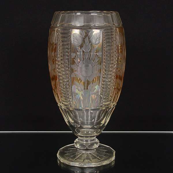 • CRISTAL OVERLAY, um (1) vaso com lapidação floral e caneluras, tonalidade amarela sobre incolor, translúcido,fuste facetado, base tetradecagonal, fundo estrelado, borda com bicadinhos, medindo 30 cm altura, sinais de uso, videfoto.