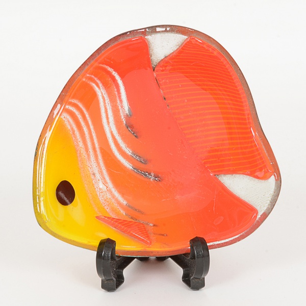 • VIDRO, um (1) covilhete representando peixe com sulfitos coloridos sobre fundo incolor e translúcido, formatotrilobado, medindo 10,5 x 10,5 cm, sinais de uso, vide foto.